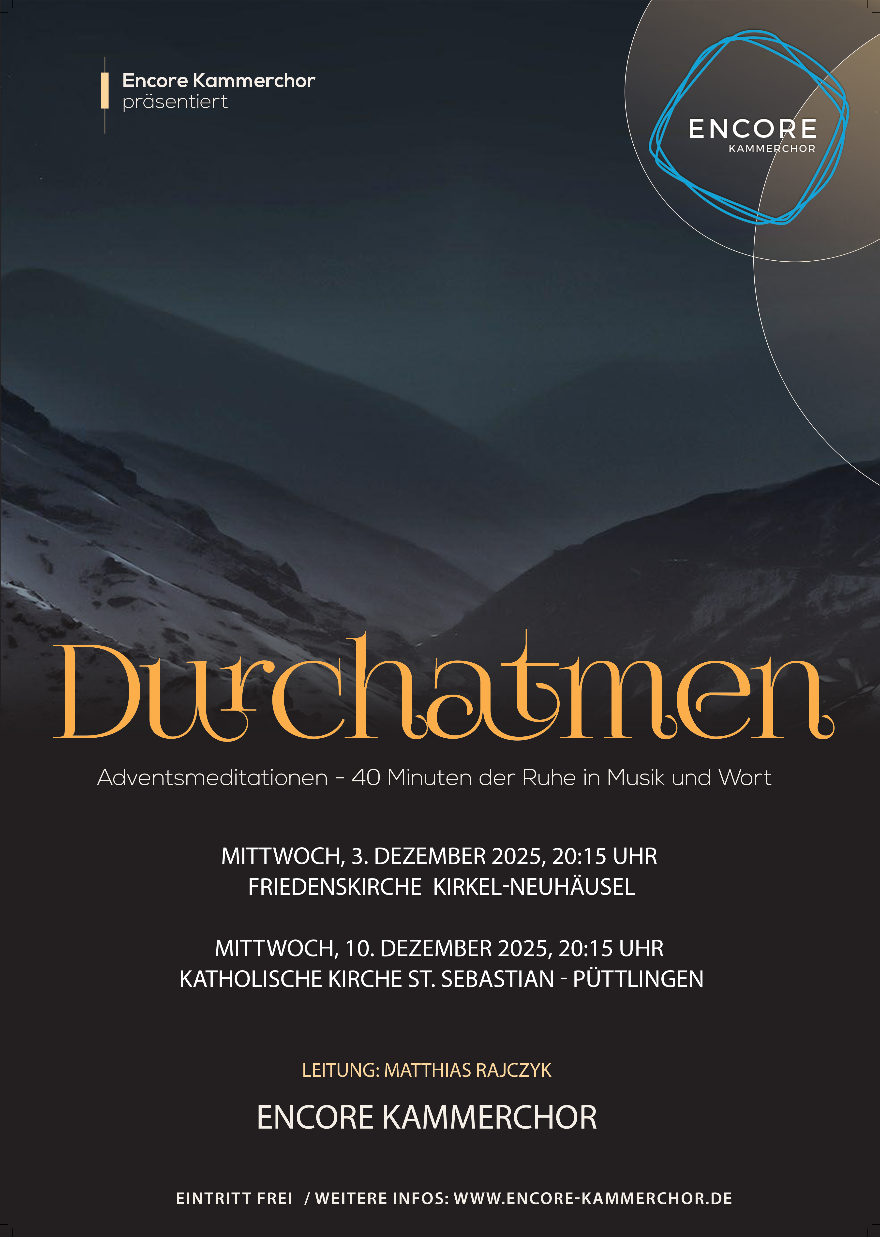 Auf Engelsschwingen – Eine chormusikalische Himmelstour mit dem Kammerchor Encore Der neue überregionale Kammerchor Encore gastiert in St. Wendel, Pfalzel und Köllerbach mit einer chormusikalischen Himmelstour unter dem Motto "Auf Engelsschwingen". Es werden Werke u.a. von Schütz, Buchenberg, Brandmüller und Whitacre zu Gehör gebracht. Die Vorstellung von besonderen himmlischen Wesen, den Engel, ist viel [...]